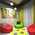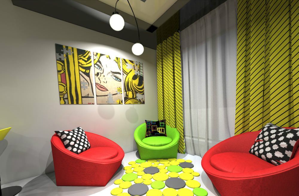 Расставить яркие акценты здесь поможет интересный декор, а также шторы.