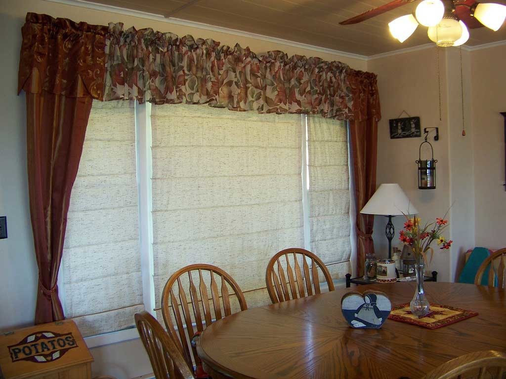К примеру, можете подобрать в зал шторы на люверсах в классическом стиле. А в кухонную зону выбирайте римские шторы.