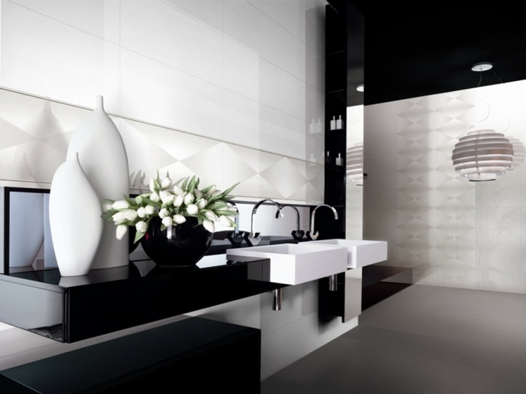 Если же потолок невысокий и неплохая ширина санузла, сделайте вставки, но только вертикальные! Или же, подберите плитку контрастных оттенков или с яркими узорами.