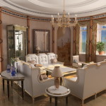 Классика – это вечно. Она была, есть и будет всегда в моде! Кроме того, классический интерьер говорит о том, что у хозяев достаточно изысканные вкусовые качества. Шторы представляют воздушную органзу, сочетаясь с тяжелыми непрозрачными тканями. Такой вариант является достаточно функциональным, поскольку органза позволяет лучам солнца «пробиваться» в гостиную, а непрозрачная ткань поможет «скрыться» от солнышка и чужих взглядов.