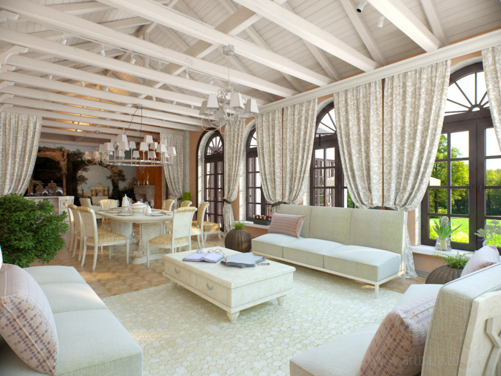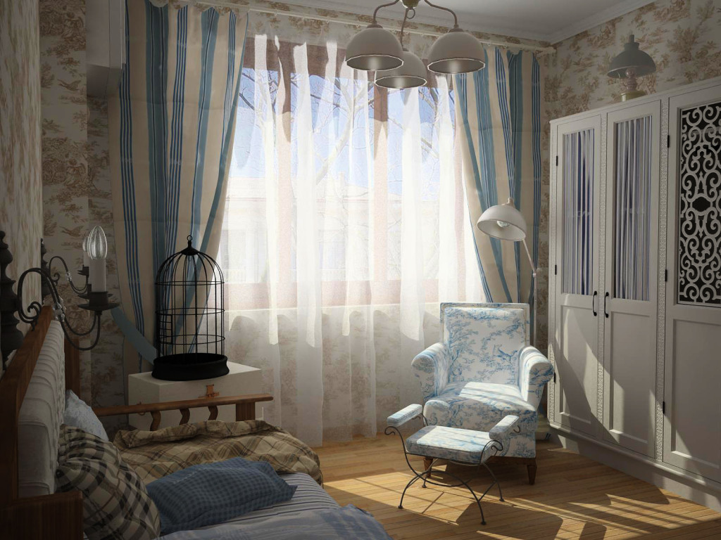 Здесь отображается деревенщина, все очень просто и скромно. Используются исключительно натуральные материалы, в том числе и дерево для потолков и полов, а шторы здесь должны быть достаточно просты в покрое и закрывать все окно. Другими словами, если рассматривать классический прованс, в нем должны быть шторы от самого потолка и до самого пола. На них могут быть самые разнообразные рисунки: цветы или целые букеты, причем абсолютно различных размеров, клетка или полоска в красно или сине-белом окрасе. Из тканей используется вышитые ситец или лен, а также целые полотна, вышитые крючком! Цвета выбирайте не очень пестрые. Используйте светлые или сочные оттенки. Обязательно учитывайте тот факт, что должен быть синий цвет. И, подбирая в гостиную новинки штор, учитывайте, чтобы они лаконично вписывались и сочетались с дизайном всей комнаты.